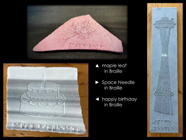 These are probably my most cherished stone art pieces I have made because of the process I experienced during the research of sandblasted Braille. I met with low vision artists in Seattle and worked closely to help make sure that even though the Braille is exaggerated, it's completely read-able. I want to give a special Thank You to Barbara Oswald in Seattle for everything she has done to encourage touchable art, it really opens up a whole new perspective. Please touch, please enjoy these pieces! Thank you!